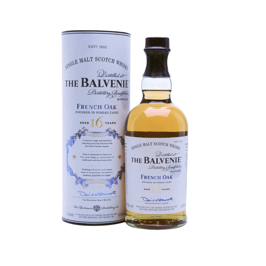 Balvenie's 16 Year Old French Oak is a member of their Cask Finishes line. This single malt whiskey begins its aging process in American oak casks before being transferred to Pineau des Charentes oak casks - typically reserved for French red wines. The nose is filled with scents of lotus, geranium, green apple, and spring meadow, while the palate offers notes of lemon peel, grapefruit, ginger, vanilla, honey, and candied fruit.